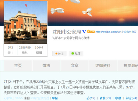此事经报道后,引发了网民的广泛关注与讨论,并通过网络寻找该男子。沈阳公安也立即介入调查。昨日,沈阳公安局官方微博通报称该男子已被查获。据介绍,7月21日下午,沈阳市239路公交车上发生一起一女孩被一男子骚扰案件。沈阳警方接到报警后,立即组织相关部门开展调查,于7月27日中午将涉嫌骚扰他人的王某某(男,37岁,沈阳市铁西区人)查获。公安机关正依法对其进行审查。