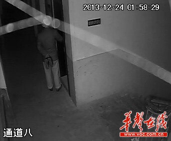 在杏子铺镇乡政府一宿舍内,阳某正将口香糖塞入门锁内。双峰警方供图。