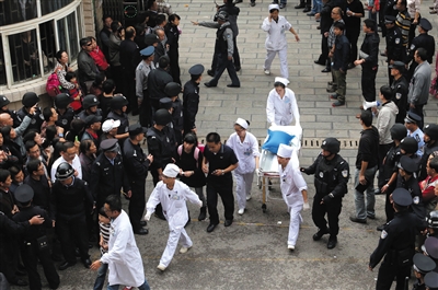 昨日,救护人员撤离昆明市明通小学。当日,该所小学发生踩踏事故,6人死亡。图/CFP