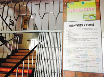 据了解,距宿舍楼不到百米的地方是小学主教学楼,一楼大厅墙上挂着《明通小学楼道安全管理制度》,规定学校要在各楼梯醒目处设置上下楼梯注意安全的警示性标语。
