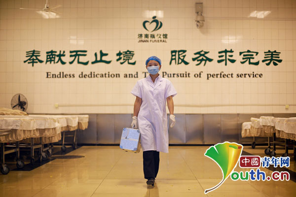 辛沙沙身材娇小,而躺着逝者的平车较高,这样有时候她不得不踮着脚尖工作,“夏天一场下来浑身都是汗,因为我们都穿着厚厚的工作服,上厕所也不方便,所以很少喝水。”辛沙沙说,“可是当看到逝者的面孔逐渐恢复,能够安详地离开,心里也就不觉得那么苦了。”