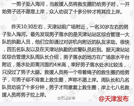 人民网北京4月27日电 据天津市人民政府新闻办公室官方微博消息,昨天10点30半左右,天津站前广场附近,一名30岁左右的男子坠入海河。几名救援人员发现落水男子后,将一个带着绳子的救生圈扔给男子,可男子却不肯套上救生圈,声称不愿上岸。
