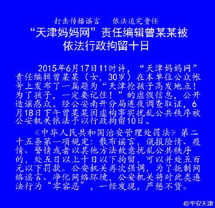 中新网6月18日电 据天津市公安局官方微博“平安天津”消息,“天津妈妈网”责任编辑曾某某发布“天津抢孩子高发地点”虚假消息,公开造谣,因虚构事实扰乱公共秩序被公安机关依法予以行政拘留10日。