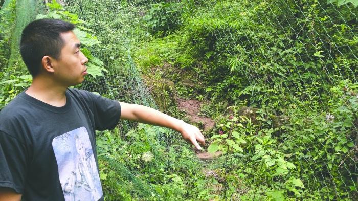 昨日,成都商报记者到了鹞子崖,罗肖的养殖场在崖边,占地100多亩,7米高的尼龙拦网将整个区域圈了起来。在拦网下,还有50多厘米高的铁丝网。靠近山体的一侧,能够看到五六处铁丝网被压倒的痕迹,而在上方还有拦网被抓破的痕迹,小的可以穿过一个篮球,大的可以让整个人通行。