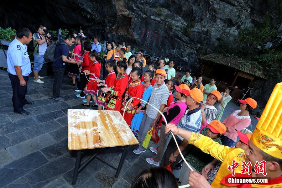 2015年10月19日消息,广东连州,千年寿乡广东连州恢复举行了始于唐代的传统重阳敬老节,吸引了数千名游客参加。连州是中国长寿之乡,敬老节传统始于唐代,到了明代已经十分流行,连州人习惯在节日当天,自制土轿抬父母到地下河拜祭钟乳石寿神,喝洞藏重阳酒,以此为安和富利之吉兆。此次敬老节主题为“重阳敬老节、寿乡连州行”,按照当地习俗,举办了“拉万米长寿面”、“千人同时传拉面连通7800米长的地下河”、“吸长寿面比赛”、“传统祭拜寿神”等活动。图片来源:CFP视觉中国