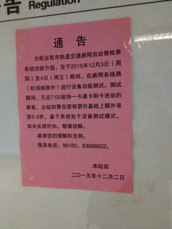 北京地铁今日消息,为配合本市地铁自动售票检票系统功能升级,明天后天期间在路网各线路(除机场线)进行设备功能测试。测试期间,凡在7点前持一卡通刷卡进站的乘客,出站扣费在原有票价基础上额外享受9.9折。