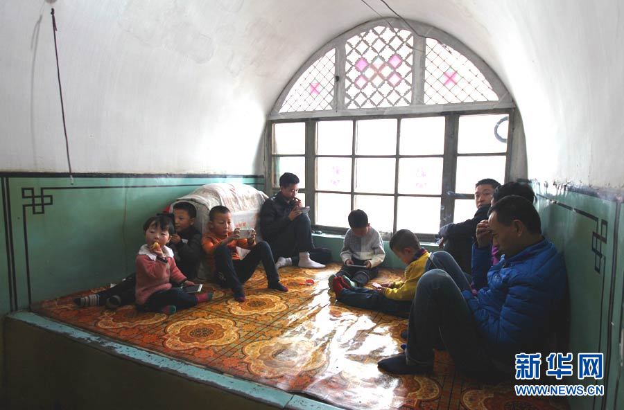 互联网的普及对乡村的影响也逐渐显现。以前全家团聚多围坐在炕上拉家常,如今,年轻人回家就玩起手机。图为东水界村郝家几个儿子回家,全家老小正忙着低头抢红包(2月12日摄)。新华网梁鸿儒 摄