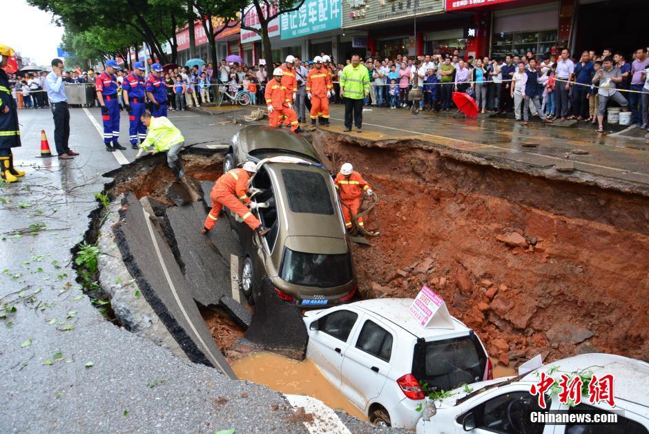 5月21日,江西省瑞金市发生一起路面塌陷事故。塌陷位置位于路边停车位区域,未波及主干道,塌陷面积约30平方米,深度3-4米,塌陷事故造成停放在路边的4辆汽车坠落陷坑。事故未造成人员伤亡,目前当地相关部门正在开展调查及道路抢修。图为当地相关部门组织消防人员救援坠落车辆。 朱燕 摄