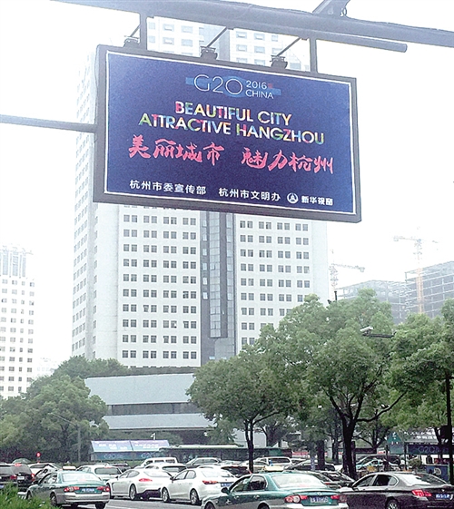 在杭州街头,随处可以看到迎接G20峰会的宣传牌。 经济日报记者 黄 平摄