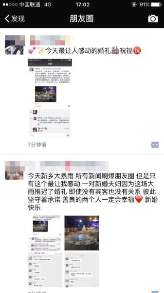 新郎做梦也想不到,老天给了他这么大的“厚礼”。 9日凌晨开始下的一场暴雨突袭新乡,市区8小时降雨量达到422.3毫米,而新乡年均降水量554毫米,8个小时下了将近10个月的雨。相比较武汉6月30日至7月6日的降雨量560.5毫米,新乡8小时的降雨量相当于武汉的5天。下午一点半左右,穿着拖鞋、背心,一身湿透的新郎敲响了新娘的房门。没有了挤门的环节,因为门外只有一个人。门开了,四目对视,猛烈的拥抱。雨水、泪水,这一刻融化在一起。 图片来源:人民网