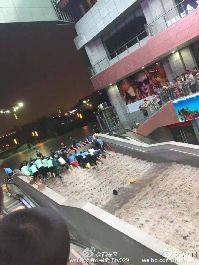 西安商场员工商户抵抗积水。