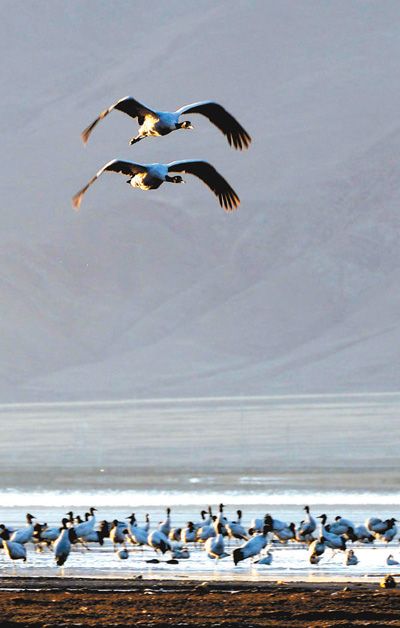 数据显示,在西藏越冬的黑颈鹤数量逐年增多,数量已由1995年的3000只上升到目前的近9000只,占全球黑颈鹤总数的80%以上。