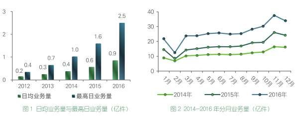 《报告》还显示,2016年,快递业务峰值出现在11月份,达37.6亿件,占全年业务量的12%;谷值在2月份,仅12.5亿件,占全年业务量的4%,季节性特征稳定。