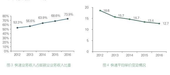 在快递价格方面,《报告》显示,2016年,快递平均单价继续下降,为12.7元,同比下降5.2个百分点。据了解,2015年快递平均单价为13.4元,这意味着,2016年,快递平均单价下降了7毛钱。