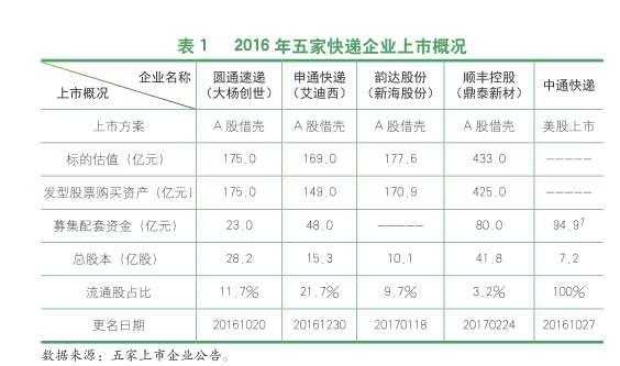 资料显示,2016年10月20日,圆通速递借壳登录中国A股市场、成为中国快递第一股;2016年10月27日,中通快递在美国纽交所上市;2016年12月30日,申通快递借壳在中国深交所上市。顺丰速递、韵达货运借壳上市方案证监会有条件通过。