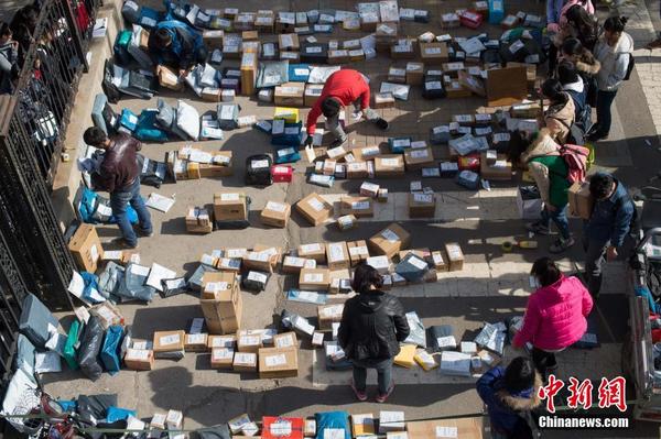 资料图:工作人员忙着分拣满地的快递。 武俊杰 摄。