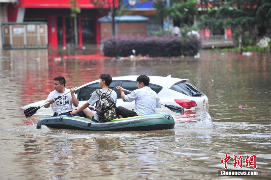 市民在积水路段划船出行。 中新社记者 刘冉阳 摄