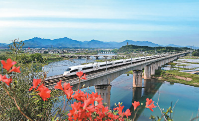 4月14日,一列动车穿行“中国最美高铁”合福线新安江休宁古城岩大桥。 |