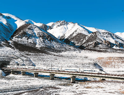 2月26日,位于甘肃、青海两省交界处的祁连山白雪皑皑,一列动车驶出被誉为世界海拔第一高铁隧道的祁连山隧道。 |