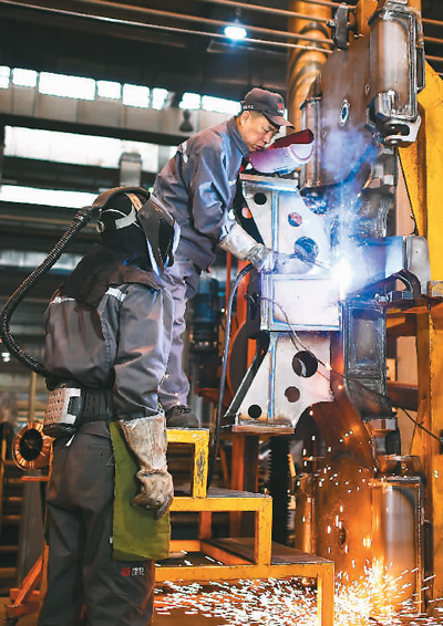 图为四月二十三日,李万君(右)在为徒弟示范焊接技巧。 |