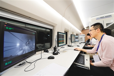 6月20日,西(安)成(都)高铁陕西段联调联试正式启动。图为当高速综合检测列车穿越秦岭时,技术人员在监测列车运行数据。 |