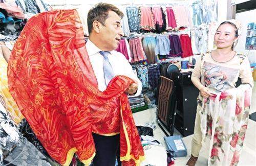2003年,伊朗商人哈米来到浙江省义乌市,做伊朗丝巾进口生意。2007年,他和中国籍妻子成立了义乌市首家由外商创办并拥有进出口权的外贸公司,如今已在北京、上海和广州开设了分公司。据义乌市公安局出入境管理局介绍,现有100多个国家和地区约1.5万名境外客商常驻义乌。图为哈米(左)在义乌国际商贸城向经营户了解丝巾流行新款式。 (新华社发)