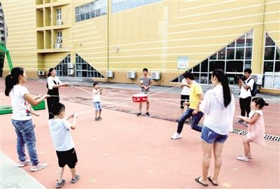 在操场上,学校还为家长和孩子们准备了亲子游戏课程——击鼓投篮、南水北调、神笔马良……游戏中,家长和孩子们认识到团队合作的重要性,明白责任和担当的作用。
