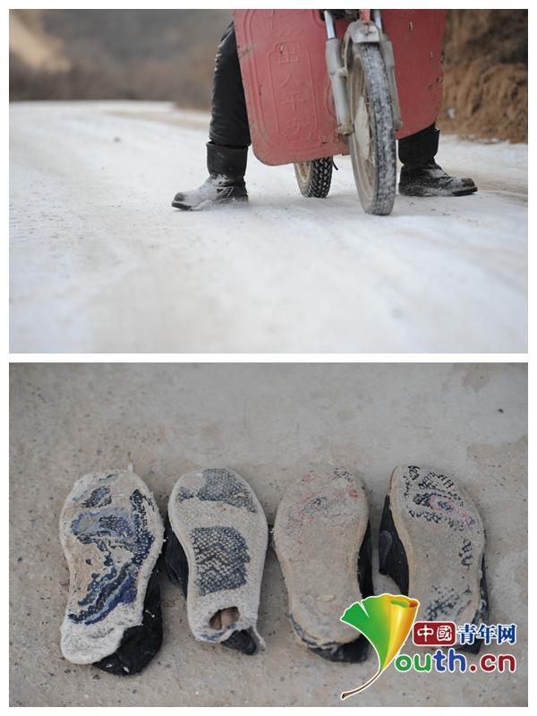 大雪天骑摩托车为大家看病的贺星龙与他磨破的鞋子。本人供图
