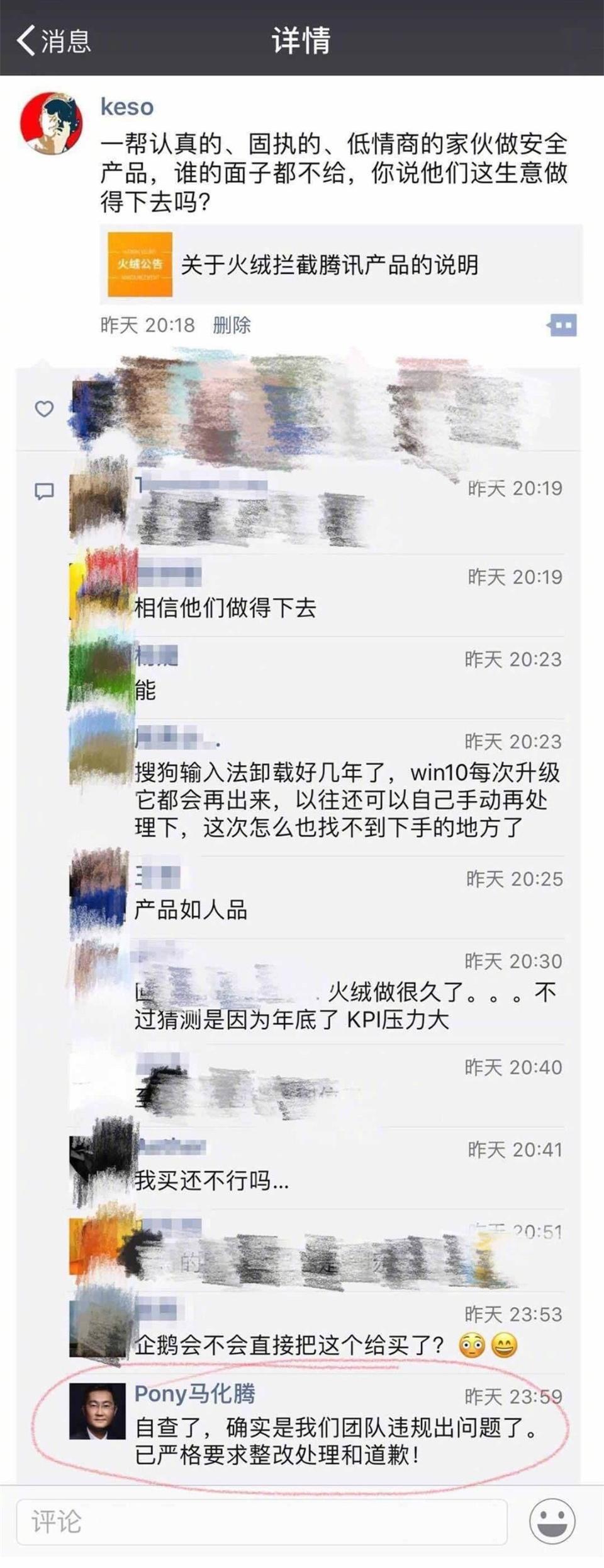 而马化腾在朋友圈回应称,“自查了,确实是我们团队违规出问题了,以严格要求整改处理和道歉!”