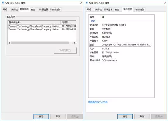 上述推广行为是由QQProtect.exe程序触发,虽然该程序的文件描述为“QQ安全防护进程(Q盾)”,但是却后台进行弹窗推广。文件属性,如下图所示: