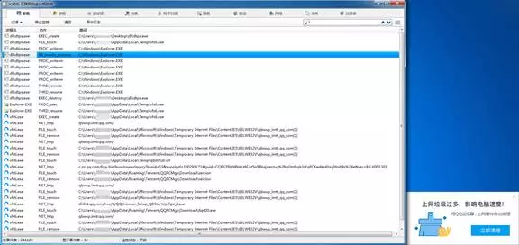 获取到xml数据之后,程序会根据红框中所示的downloadfile标签url属性将最终的推广弹窗程序下载到” %temp%\dlqltps.exe”目录中进行执行,该程序注入explorer后,用explorer进程启动vfsti.exe弹出诱导推广弹窗。行为如下图所示: