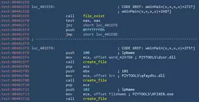 第二组推广程序,推广流程更加复杂且更为隐蔽。推广流程还是由QQProtect.exe进程触发,首先会下载执行“MOXD1218.EXE”(简称为MOXD程序),在该程序的资源中包含有一个可执行程序(XFIXER.exe)和两个动态库(qfaydtc.dll和dzor.dll)。
