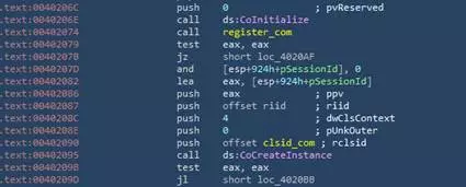 XFIXER.exe会被注册成COM接口,MOXD程序调用COM接口后,会由svchost进程启动资源中包含的可执行程序XFIXER.exe。调用代码如下图所示: