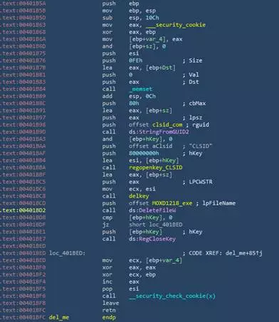 在执行完COM接口调用之后,MOXD程序会尝试删除之前注册的COM接口注册表项和自身文件。代码如下图所示: