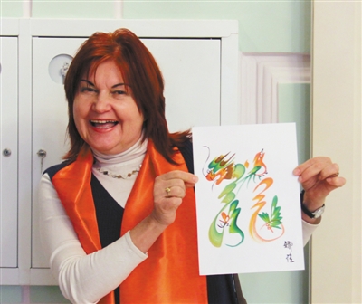 2月14日,莫斯科中国文化中心在中共六大会址常设展览馆举办了2018年新春联谊会。图为一位嘉宾展示中国民间艺人创作的龙形字画。 |
