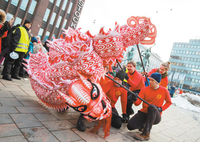 2月15日,第十二届“欢乐春节·赫尔辛基庙会”在芬兰首都赫尔辛基举行,吸引大量民众参加。图为当地人在舞龙。 |