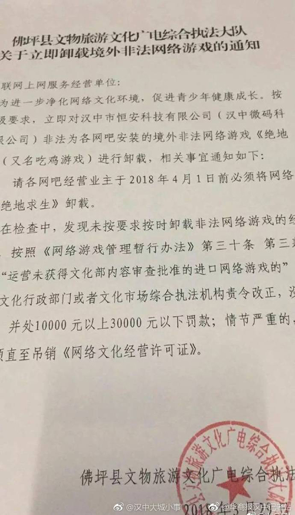 华商报汉中3月30日消息,近日,因汉中市政府网上市长信箱一封举报信,将《绝地求生》(又名吃鸡游戏)推上风口浪尖。网传汉中文化执法部门要求全市网吧卸载此游戏,并称该游戏未取得文网游许可证,对于拒不卸载的网吧进行罚款处罚。