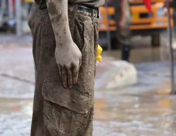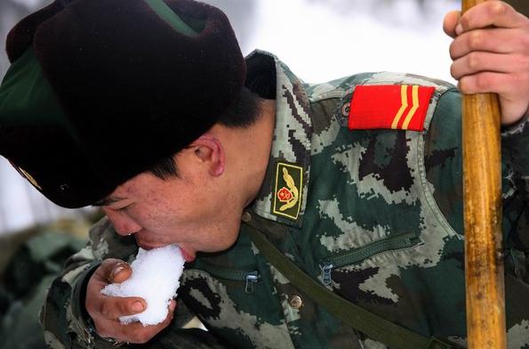 2008年2月3日,一名武警战士在京珠高速公路破冰铲雪间隙吃雪解渴。(来源:新华社)