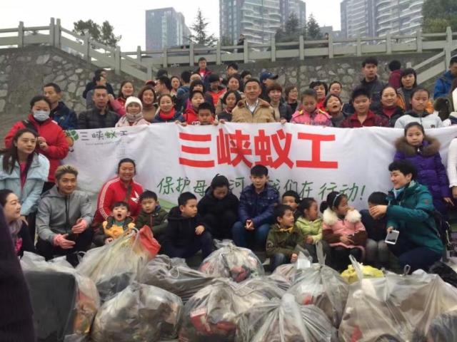 ↑资料照片:“三峡蚁工”捡完垃圾后合影
