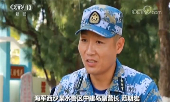 海军西沙某水警区中建岛副营长范期宏 :他们登上这座岛的第一件事,就是竖一根旗杆,把国旗升起来。在我们这个岛上竖上我们的主权碑,上面写着中华人民共和国领土中建岛。