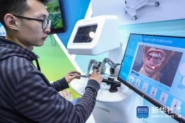 ↑10月9日,工作人员在“双创周”北京会场主题展上展示一款口腔手术模拟器。新华社记者张玉薇摄