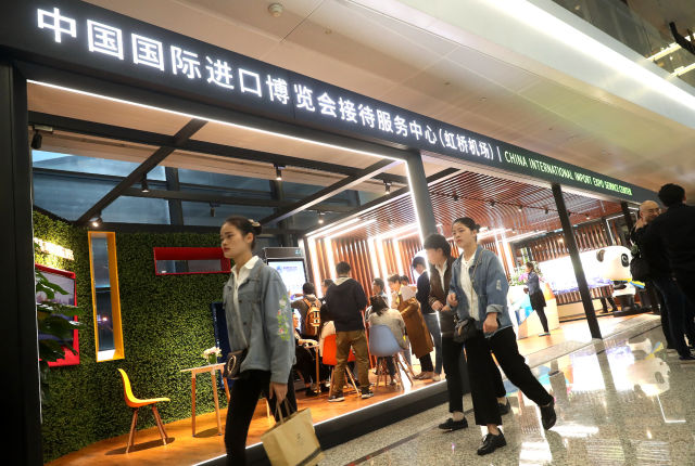 旅客从上海虹桥国际机场的中国国际进口博览会接待服务中心前走过(10月24日摄)。新华社记者 陈飞 摄