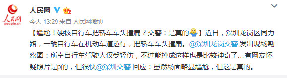 近日,深圳龙岗区同力路,一辆自行车在机动车道逆行,把轿车车头撞扁。@深圳龙岗交警 发出现场勘察图:所幸自行车驾驶人仅受轻伤,不过能撞成这样也是比较神奇了…有网友怀疑照片是p的,但很快@深圳交警 回应:虽然场面略显尴尬,但这是真的。
