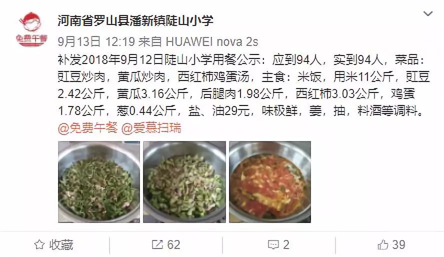 2018年9月,中国青年报发现@德昌县麻栗乡一干海学校 、@湖北省鹤峰县潼泉小学 等多所学校的官方微博,多年来一直坚持公布孩子们每天的午餐情况。原来免费午餐项目要求受捐学校开微博每天公示开餐情况,网友刷屏:是本分,却让人感动。