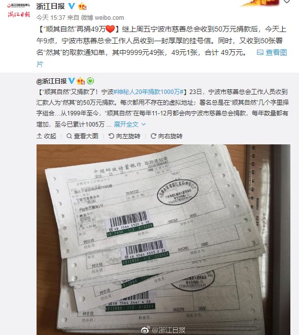 2018年11月28日,宁波市慈善总会工作人员收到49万元捐款,距离上次收到50万捐款(其中9999元50张、50元1张)仅隔了5天。也就是说,“顺其自然”今年捐款总共合计99万,累计捐款1054万元!这是一位特殊的慈善人士,虚构的地址,虚拟的姓名,一堆汇款单……他(她)隐于市井、难见身影,但美名远播、家喻户晓。