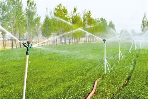 河北省廊坊市大城县贾庄村小麦浇水采用了喷灌技术,节约水资源的同时,避免了土壤板结。 (摄于2018年4月)