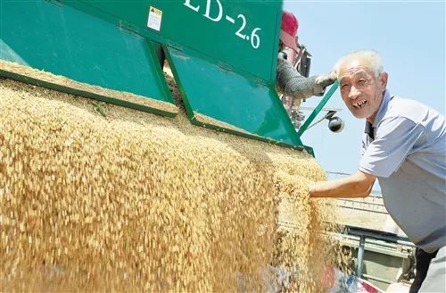 河北省廊坊市大城县韩村麦农用联合收割机收割小麦。进入21世纪后,当地农业机械化水平逐年提高。(摄于2012年6月)