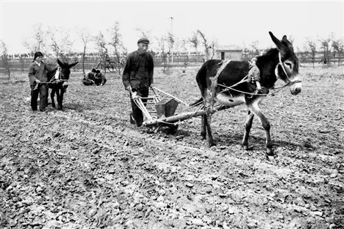 上世纪80年代,河北省廊坊市大城县付庄子村村民用毛驴耕地播种玉米。 (摄于1980年4月)