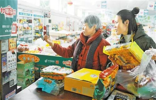 河北省廊坊市大城县南楼堤村超市,村民在“扫一扫”购物。如今大城县村邮乐购站点已达394处,覆盖全县所有村街。 (摄于2018年12月)