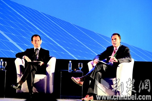 图为:孝感易生新材料公司董事长杨义浒(左)在中拉企业高峰论坛上发言。(记者 雷闯 摄)